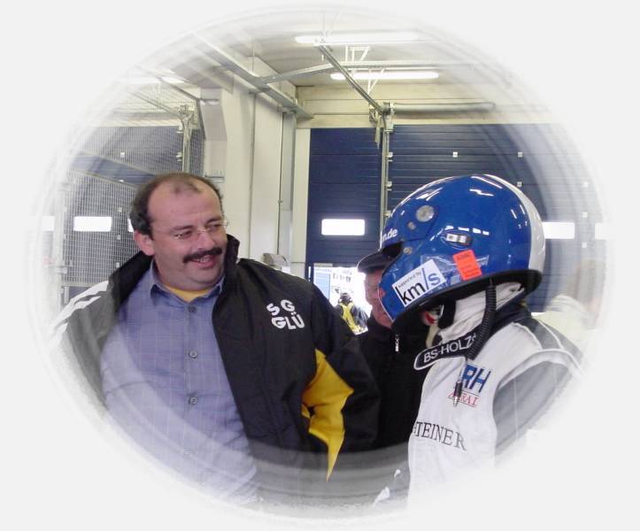 Arno übernahm und konnte relativ schnell zum führenden Porsche, jetzt bewegt von Willi Kern, aufschliessen und vorbeigehen. Allerdings wurde er jetzt von W. Kern stark unter Druck gesetzt. Nach Runde 22 mussten wir dann noch zu einem kurzen Tankstopp hereinkommen. Wir entschieden uns, das Risiko einzugehen und keine neuen Reifen aufzuziehen. Arno ging mit einem Vorsprung von 4 Sekunden in die, wie wir dachten, letzte Runde. Allerdings kam er dann genau 1 Sekunde zu früh bei Start- und Ziel vorbei und musste so noch eine Runde drehen. Und das mit Olaf Manthey auf neuen Reifen im Schlepptau!
