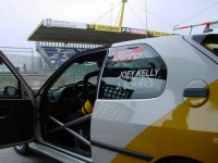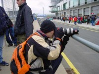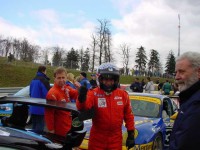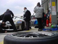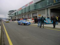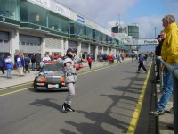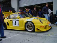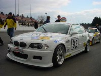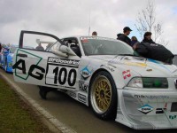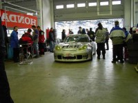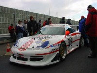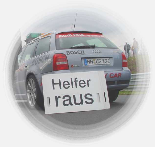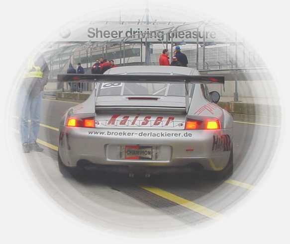 Die Startaufstellung für die erste Gruppe fand, aufgrund des Umbaus der Grand Prix Strecke, in der Anfahrt zur Hatzenbach statt. Ganz schön weit zu marschieren. Jürgen erwischte dann einen sehr guten Start, wurde aber von Olaf Manthey ausbeschleunigt. Wie sich später herausstellte, hatten wir mit Wahl unserer Hinterreifen glatt verwachst. Das starke Übersteuern wurde uns sogar von Zuschauern an der Strecke bestätigt. Jürgen konnte nichts anderes tun, als zu versuchen den Rückstand bis zum Boxenstopp möglichst gering zu halten. Nach dem Boxenstopp übernahm Arno, er sollte eigentlich bis zum Schluß im Auto bleiben. Bereits in seiner zweiten Runde wurde das Rennen aufgrund des Unfalls am Schwedenkreuz mit der roten Flagge gestoppt.